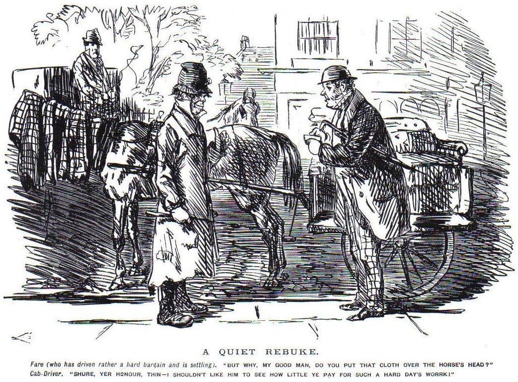 A Quet Rebuke. Cartoon by John Leech (1817-1864), Punch, 1864.Fare (who has driven a hard bargain and is settling), "But why, my good man, do you put that cloth over the horse's head?" Cab-Driver, "Shure, yer honour, thin -- I shouldn't like him to see how little ye pay for such a hard day's work!" Punch readers in 1864 would readily identify the stereotypical Irishman from the brogue in the caption, his carefully delineated facial features and the ragged state of his clothes, but it's the jaunting car that places the scene in Ireland rather than in an English city. Cartoonist Leech's sympathies are obviously with the cabby in keeping with the magazine's early radical-reform posture. But as Punch became more successful its politics increasingly reflected the interests of the cab riding as opposed to the cab driving class. Out of 26 cab cartoons in the Pictures from Punch collection (1894), at least 18 make disreputable drivers, emaciated horses and/or dilapidated cabs the butt of the joke.
