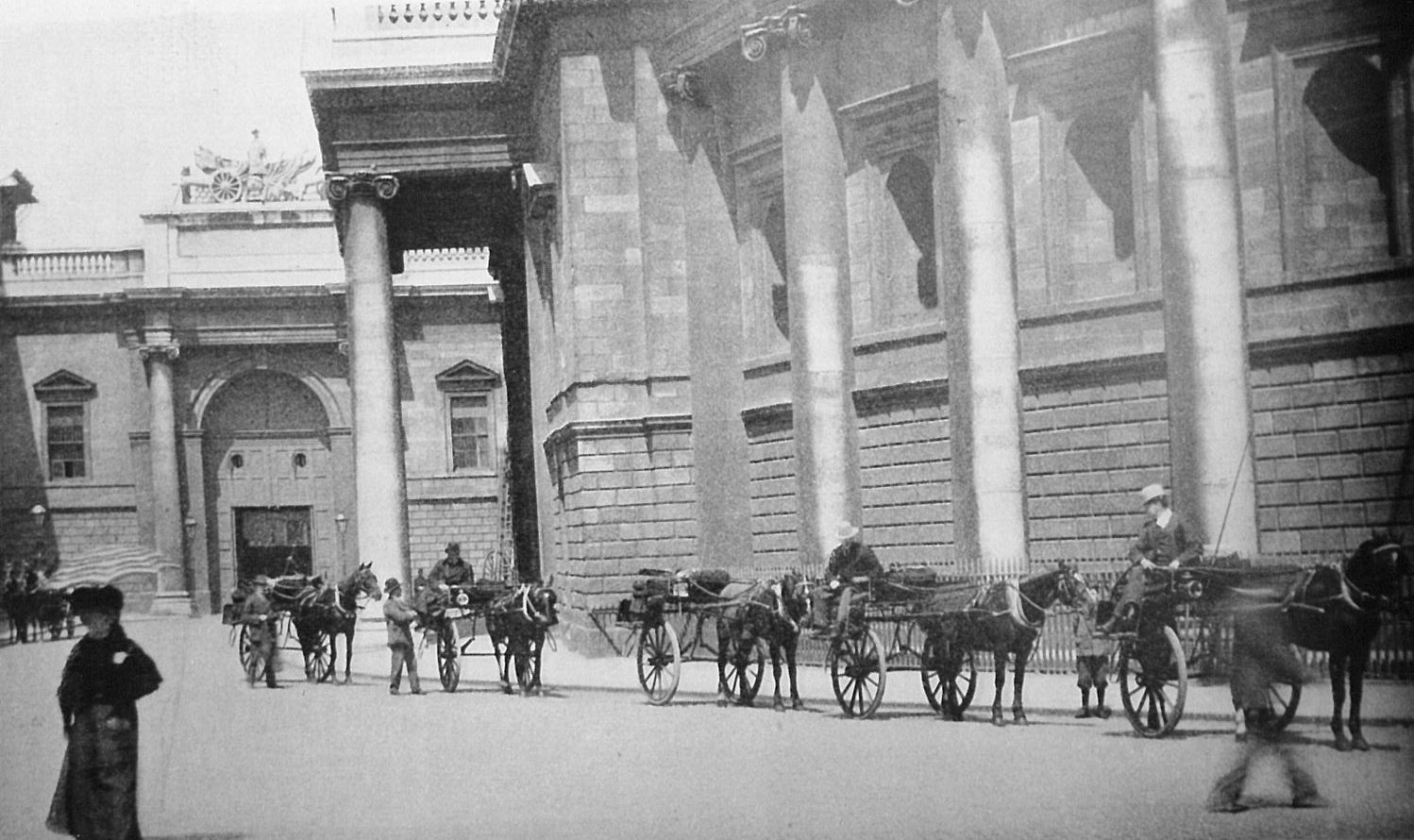 Jarvies and jaunting cars wait for fares on a "hazard" located on the north side of College Green (see also page 32. For more pictures of jaunting cars, see Vance Thompson's Cab Drivers: How Pat Travels.