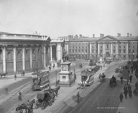 College Green is a three-sided square in the centre of Dublin with Trinity College (top of picture) on the east side, the Bank of Ireland (left) on the north side, and a row of large commercial buildings, many of them banks, on the south side. College Green is mentioned four times in Ulysses and Leopold Bloom carries a passbook from the College Green branch of the Bank of Ulster. In the foreground a fourwheeler and a jaunting car are parked on a "hazard" in the middle of the green. Another group of cabs is parked on a second stand beyond equestrian statue of William of Orange (King Billy) which was blown up by Republicans in the 1930s. For another picture of College Green, see page 13.