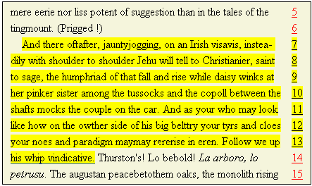 The picture at left gives us a little taste of Finnegans Wake to put us in the proper frame of mind to appreciate the relative lucidity of Ulysses. Here's what some of it (possibly) means: