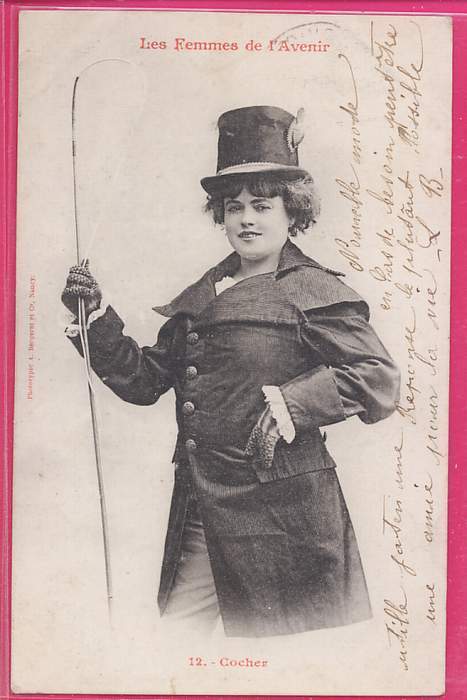 Picture (left): Women of the Future: The Cab Driver. The series "Women of the Future" featured models in stylish adaptations of male attire representing occupations which women rarely entered, or from which they were actually barred; for example, soldier, sailor, doctor, lawyer, journalist, politician, cab driver. This card may have predated the appearance of the femmes cocher.