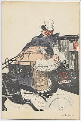 Les Femmes Cocher / 110 Humour / 10 Picture (left): Cochères.A femme cocher finds a way to look after her baby while driving a cab.
