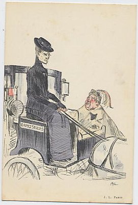 Humour / 11 Picture (left): Cochères.A stereotypical feminist picks up a stereotypical dowager. The sign on the driver's seat reads "Dames Seules" ("Ladies Only").