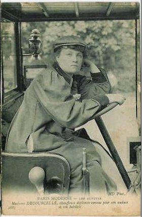 Picture (left): Mme. Decourcelle The caption is hard to read, but it seems to be praising her "audacity and skill". Mme. Decourcelle's celebrity won her a starring role in a series of postcards entitled "Chauffeuse d'Autotax" ("Woman Taxi Driver").