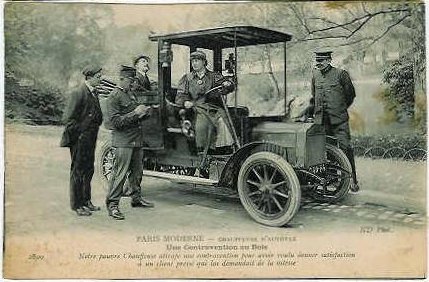Picture (left): A traffic ticket in the Bois de Boulogne. Our poor chauffeuse receives a traffic ticket for having tried to satisfy a hurried client who asked her to speed. In London horse cabs were only required to travel at four miles an hour which was about all that the average cab horse could manage when pulling a loaded four-wheeler. In Winnipeg, where horse cabs were pulled by two horses, owners protested when the 1910 city council proposed a minimum speed of seven mph. Some motor cab drivers used the minimum speed limit to their advantage. The 1907 Baedeker guide to London warned visitors that they should tip taxi drivers generously if they wanted to travel faster than four miles an hour.