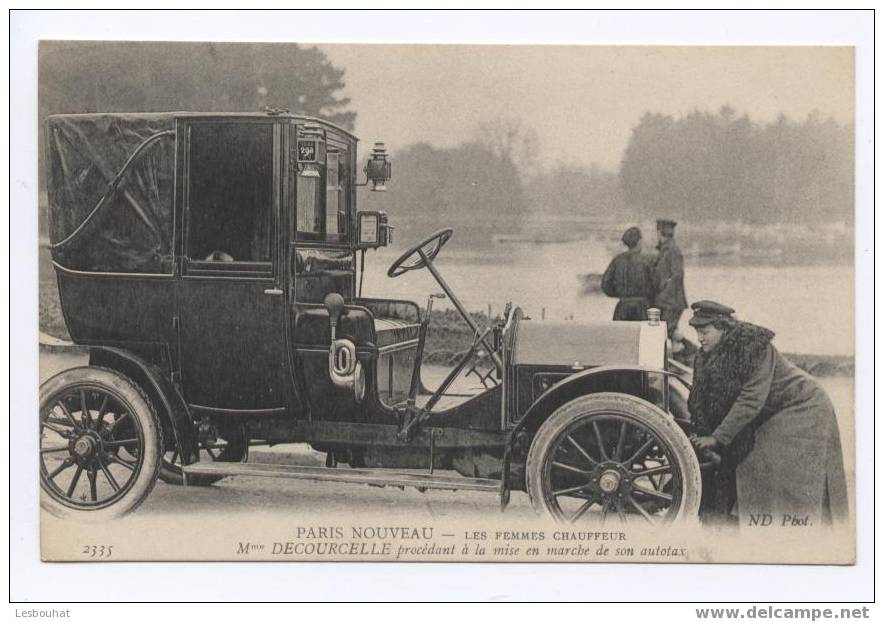 Picture (left): Mme. Decourcelle getting her car started. Until the invention of electric starters cars had to be hand-cranked to get them going. This was a tricky and even dangerous process – a backfire could produce a sprained or broken wrist.