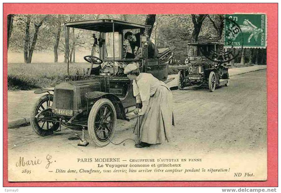 Picture (left): A chauffeuse with a broken down taxi. The stingy and grumpy traveller: "Say, driver, you really should stop the meter during repairs!"