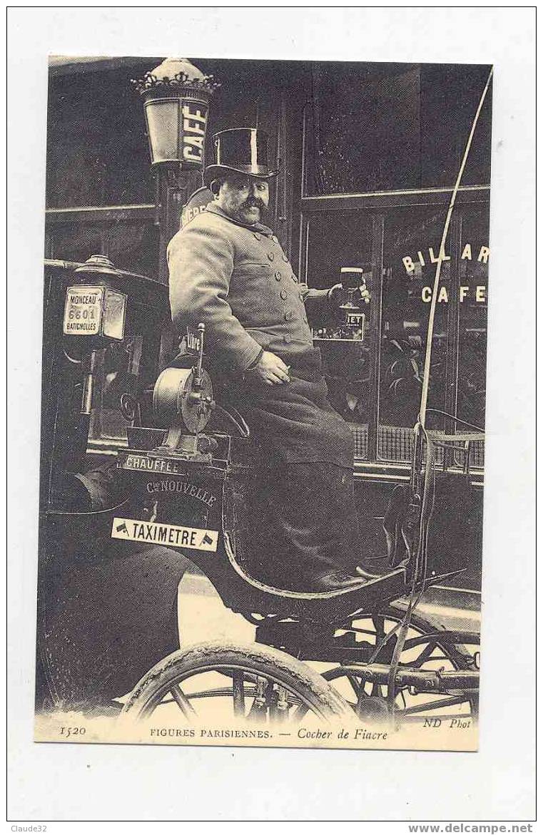 Picture (left): The cab driver. A cab driver takng a break with a cigarette in one hand and a glass in the other. Cab laws required drivers to stick close to their cabs to prevent horses from running away and even though this restriction was not rigidly enforced the fear of missing a fare was a strong deterrent against drivers abandoning their cabs for very long. As a result, cab stands attracted entrepreneurs who provided various services for a fee – wiping down cabs, fetching water for horses, or bringing drivers sandwiches and drinks. This cab belongs to the Compagnie Nouveau (New Company). The sign below the meter announces that the cab is a heated ("chauffée"). The cab number appears on the lamp, along with cab's home district, Monceau-Batignolles. The meter's flag is in the "up" position, so the meter is not running.