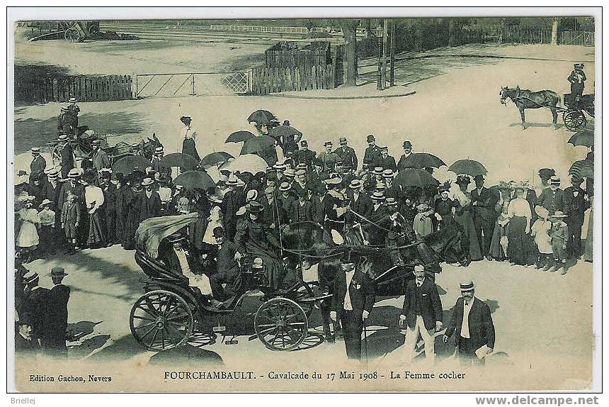 Picture (left): Fourchambault. Cavalcade of May 17, 1908. The woman cab driver Fourchambault is a small town about 255 km southeast of Paris. In May, 1908 it was the site of a major agricultural fair and this is one of several postcards commemorating the event. Since it is rather unlikely that the couple in the cab drove all the way from Paris, this postcard suggests that the femmes cocher phenomenon had spread to other parts of France.