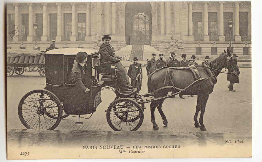 Picture (left): Mme. Charnier. A passenger illustrates the lack of an easy means of communicating with the driver from inside the fiacre. If the door pops open he will soon be lying in the gutter. The fiacre carriages were also called "coupés", meaning "cut off", because the two-seater was essentially a shortened version of the four-seater. The word has survived into the automobile age. In cab driver slang the fiacre was a "sapin" (fir tree). Nobody seems to know why.