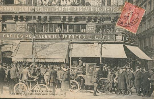 Picture (left): Mme. Dufaut, Boulevard Sevastopol. A huge crowd has apparently gathered on the sidewalk to see Mme. Dufaut. But the crowd is standing in front of the offices of ELD, the postcard publisher responsible for the photo. Did ELD have a hand in generating all the excitement?