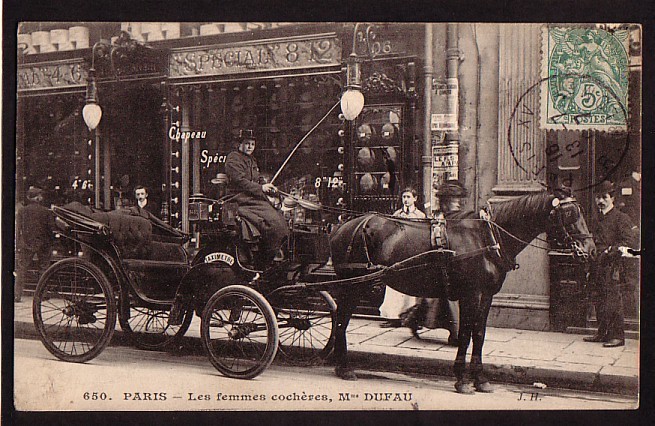 Picture (left): Mme. Dufaut. This photo is one of a series that was apparently taken on a day when the weather was a bit warmer. Mme. Dufaut is now driving an open cab or "caleche". The hood is down, so there's no threat of rain.