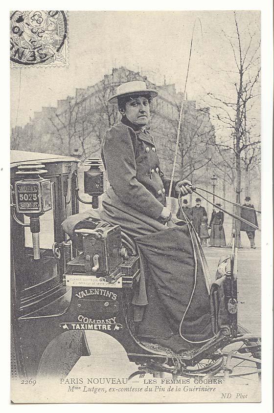 Picture (left): Mme Lutgen, ex-comtesse du Pin de la Guérinière. Mme. Lutgen's square meter is a different style from the round ones on the cabs driven by some of the other women. The cab's number (5073) is painted on the carriage lamp but the license plate that used to appear between the words "Valentin's" and "Company" is no longer there. License plates may not have been required if cab numbers were displayed on lamps.