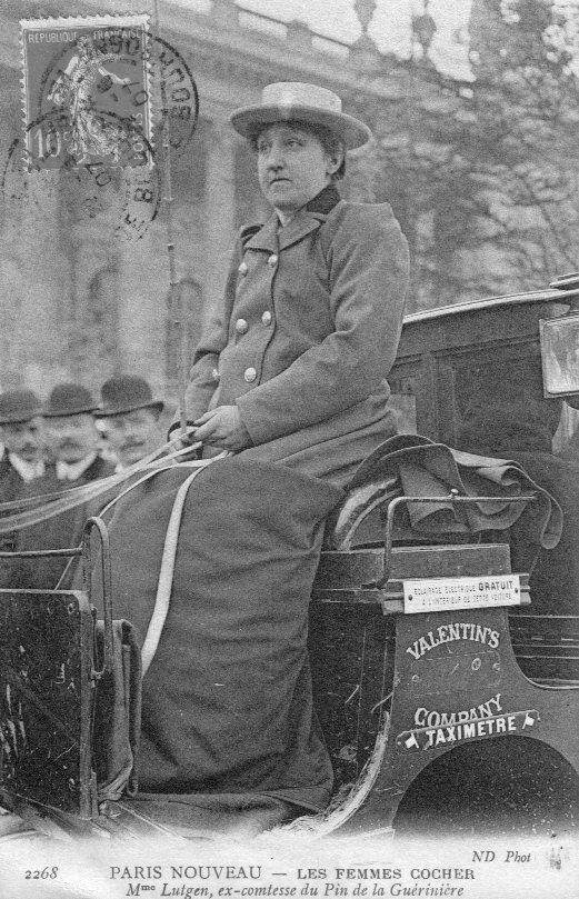 Picture (left): Mme Lutgen, ex-comtesse du Pin de la Guérinière. The place where the number plate used to be is evident in this photo. The sign on the driver's seat reads "Éclairage electrique GRATUIT à l'intérieur de cette voiture" ("FREE electric light inside this carriage"). This innovation may have arisen from the fact that cabs were forced to carry batteries to power their electric meters. The carriage lamps flanking the driver's seat were probably electric as well. Not much power was required because the purpose of the lamps was simply to make the cab visible to customers and other traffic, not to light the way ahead. Some cabs also advertised that they were "voitures chauffées" or "heated carriages" and charged extra for this luxury.