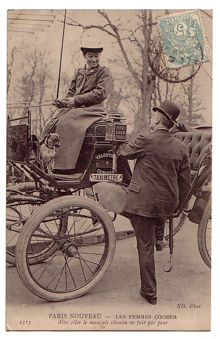 Picture (left): With them, a bad road holds no terrors. The femmes cocher cards could easily have descended to cheap jokes at the women's expense but instead they frequently emphasize their professional competence as cab drivers.