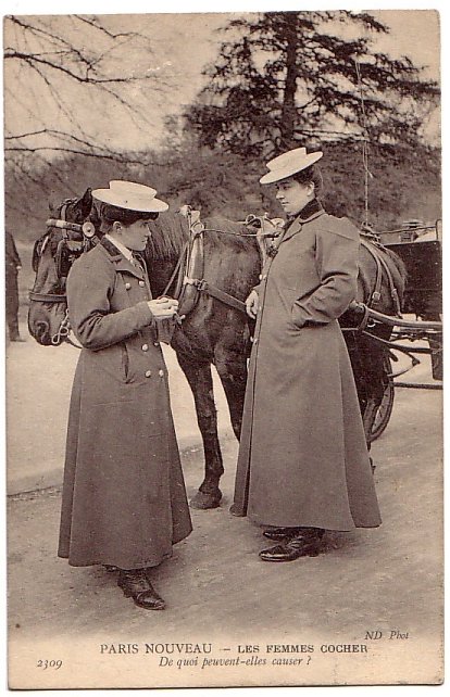 Picture (left): What could they be chatting about? Mme. Moser and Melle. Vilain. A variant of this card is captioned "A chat while waiting for a customer."