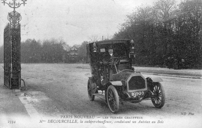 Picture (left): Mme. Decoucelle, the cabwoman-chauffeur, driving a taxicab in the Bois de Boulogne. Once women were granted horse-cab licenses they could not very well be refused motor cab licenses. And women could see, just as plainly as men, that horse-cabs were on their way to extinction. The automobile's novelty attracted customers but so did its speed and convenience. At 20 to 30 mph, automobiles travelled four to six times as fast as horse cabs. The speed meant more trips for the driver and therefore more money.