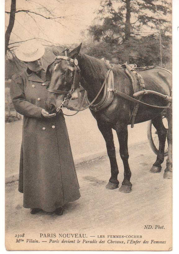 Picture (left): Melle. Vilain. – Paris becomes a Paradise for horses and a hell for women. A variation of the previous card with a rather sinister caption, perhaps reflecting an awareness that some of the femmes cocher were experiencing difficulties and dropping out of the cab trade. The repetitive poses in the horse-cab pictures show how avid the buying public was for such images and how postcard publishers could commission many photographs on a single theme in the confident expectation that all of them would sell.