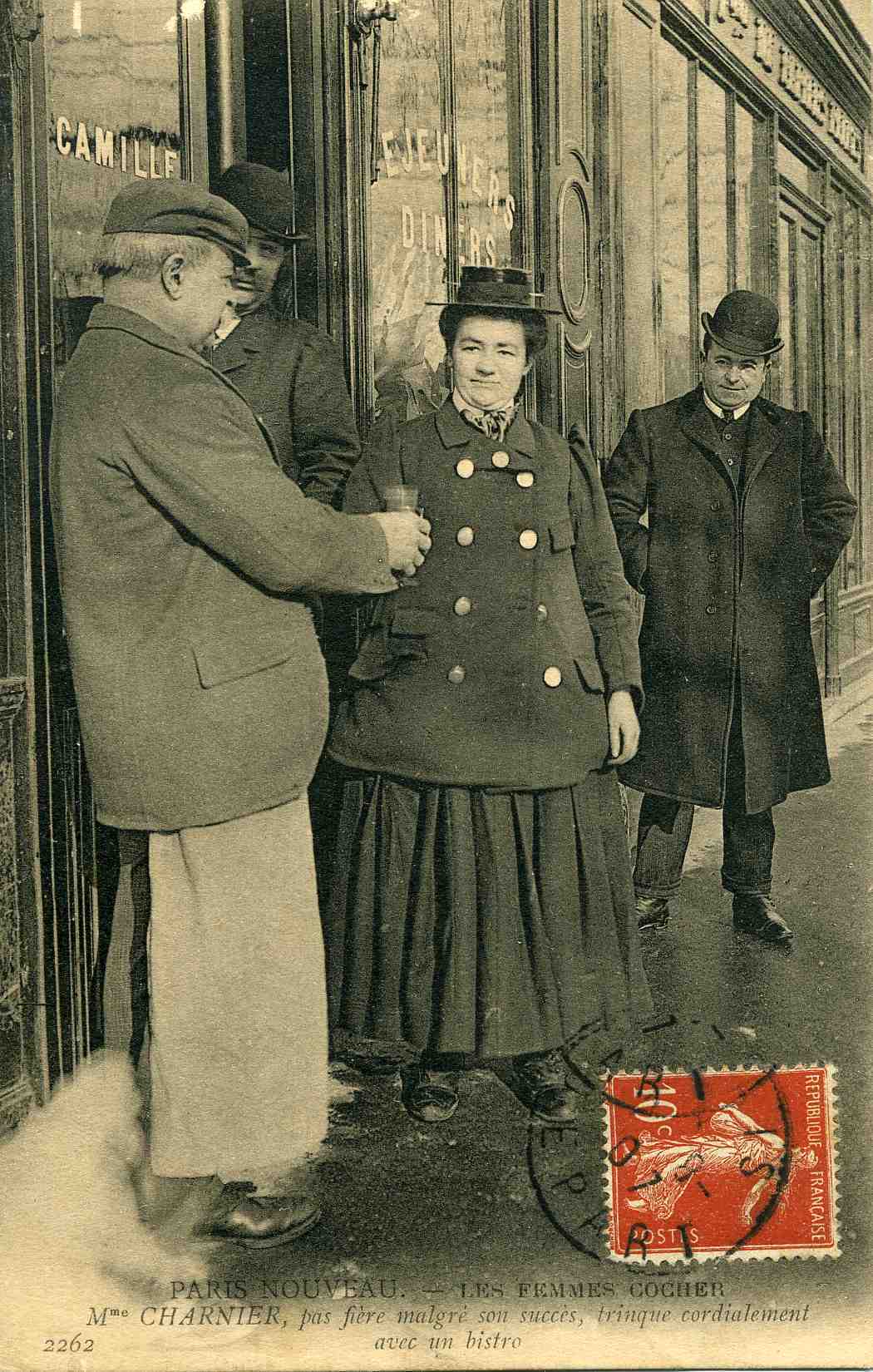 Picture (left): Mme. Charnier, not conceited despite her success, cordially clinks glasses with a bartender. It's quitting time and Mme. Charnier is back at the bar. The considerate barkeep has apparently greeted her on the sidewalk with a drink. Although the weather looks chilly the snowy blob in the lower left corner is probably a dog that got up and moved while the camera lens was open.