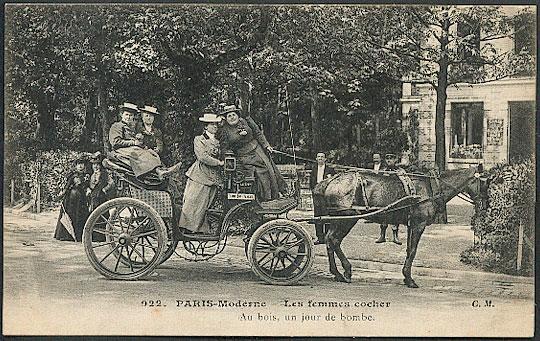 Picture (left): Out on a spree in the Bois de Boulogne. Mme. Moser, Mme. Decourcelle, Melle. Vilain and Mme. Véron take a break from cab driving. We've seen this restaurant before (Mme. Decourcelle, 4) and it is probably the location of the next card as well.