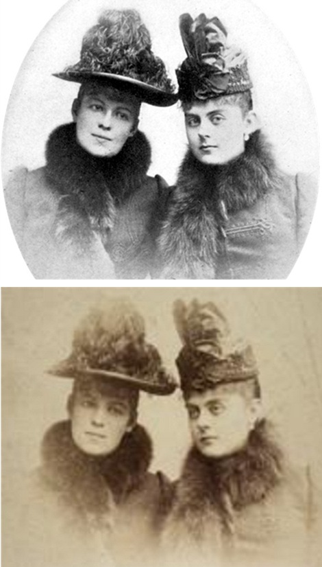 Since the Countess was Rudolf's first cousin Mary pestered her to arrange a meeting with him. The Countess claimed to have resisted Mary's entreaties until finally, on November 5, 1888, she took Mary to the Hofburg to meet Rudolf. They celebrated this momentous event the next day by having their picture taken (left) and probably ordered multiple copies to distribute to friends.