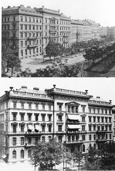 Top: The Karntner Ring with the Grand Hotel, 1888 (detail). The Karntner Ring is one of the nine sections of the Ringstrasse, the circular boulevard that rings the city centre.