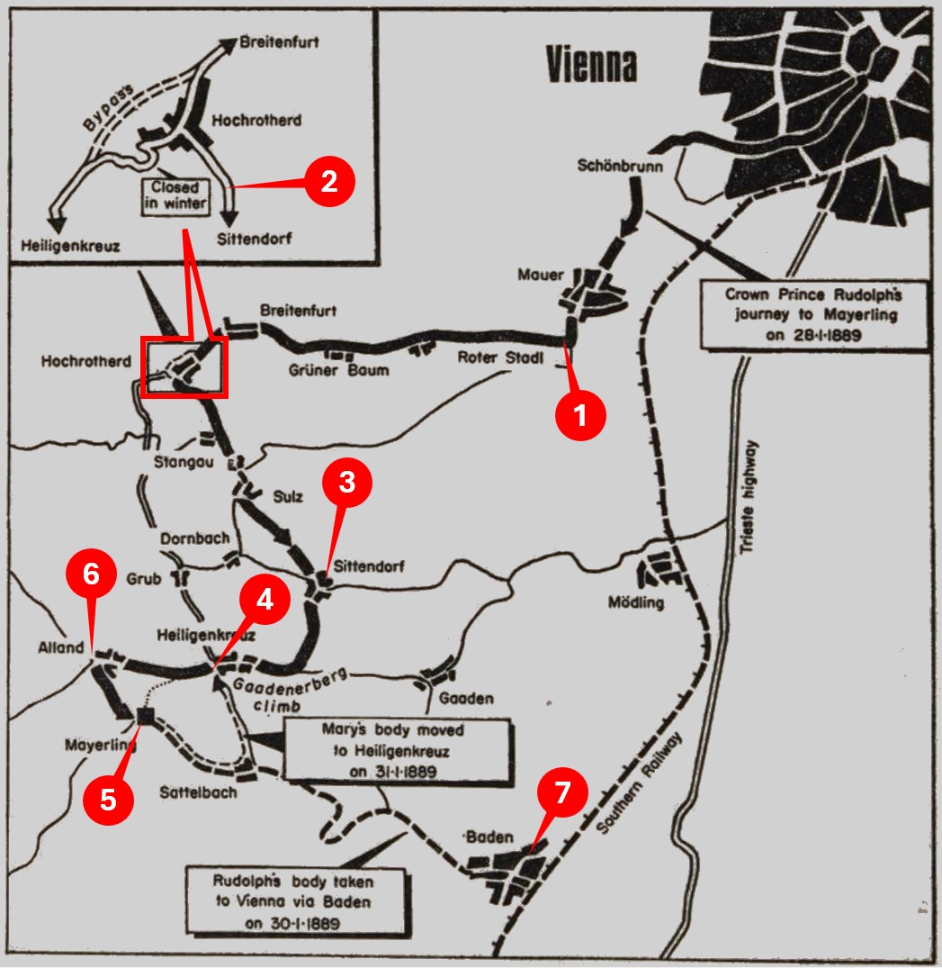 The normal route to Mayerling was by train from Vienna to Baden with a drive of about four miles from Baden to the hunting lodge. A team of catering staff and other servants had already taken this route to Mayerling to prepare the lodge for Rudolf and his guests. But going by train was unthinkable if he and Mary were to reach Mayerling without attracting notice. The only alternative was a long, cold, arduous trip by cab.