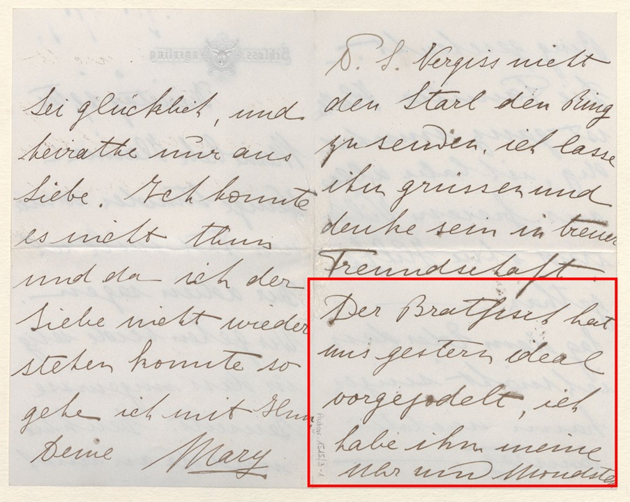 The postscript to Mary's letter to Hanna refers to Josef: "Bratfisch yodeled perfectly for us yesterday, and I gave him my watch and moonstone ring."