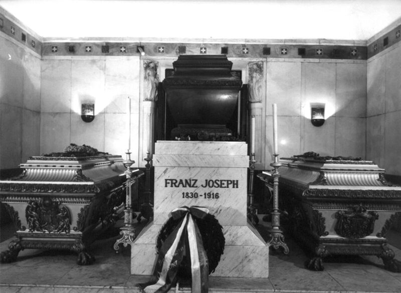 Above: Sarcophagi of Empress Elisabeth, Emperor Franz Josef and Crown Prince Rudolf in the imperial crypt below the Capuchin Church, Vienna, 1980. Photo credit Alfred Cermak.