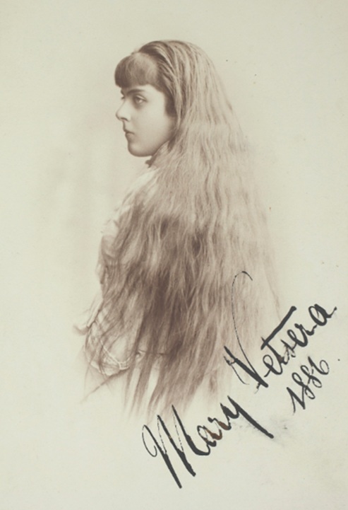 Above: Mary Vetsera, 1886 (detail). According to Fritz Judtmann, this is probably the photo that Helene provided as a model for the Virgin Mary's face in the stained glass window in the Heiligenkreuz chapel.