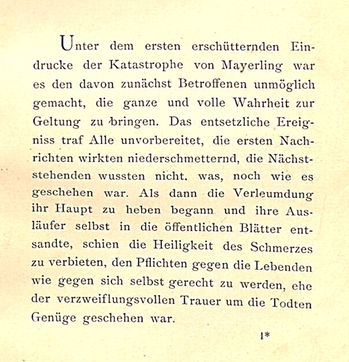 Above: The opening sentences of the printed version of Helene Vetsera's memorandum (detail). "Under the initial, shocking impression of the Mayerling catastrophe, those initially affected were unable to bring the whole truth to light. The horrific event caught everyone off guard; the initial news was devastating, and those who survived it did not know what had happened or how. When slander began to raise its head and send its spurs even into the public papers, the sanctity of pain seemed to forbid fulfilling one's duties towards the living as well as towards oneself before the desperate grief for the dead had been satisfied." Source: Osterreichische Nationalbibliothek (Austrian National Library).