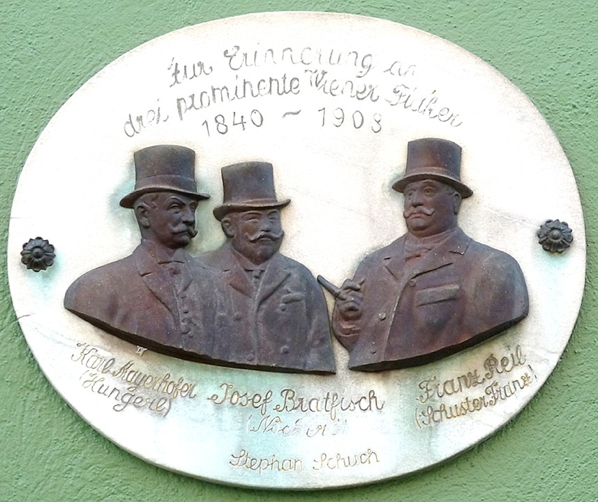 Above: Memorial plaque by artist Stephan Schuch located at Lacknergasse 60 in Vienna: "In memory of / Three prominent Vienna Cab Drivers / 1840 - 1908 / Karl Mayerhofer (Hungerl) / Josef Bratfisch (Nockerl) / Franz Reil (Schuster Franz) / (Stephan Schuch)." Source: Hedwig Abraham, Kunst und Kultur in Wien: Gedenktafeln in Wien: Josef Bratfisch (Art and Culture in Vienna: Memorial Plaques in Vienna: Josef Bratfisch).