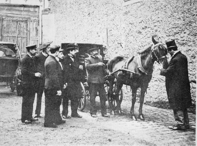 Explaining the Points of the Harness. Photo by V. Gribayédoff.M. Pernette's overcoat and top hat are meant to exemplify correct dress for a Paris cab driver. The largest companies provided uniforms, but even the shabbiest of drivers usually wore a top hat as a kind of badge of the trade.