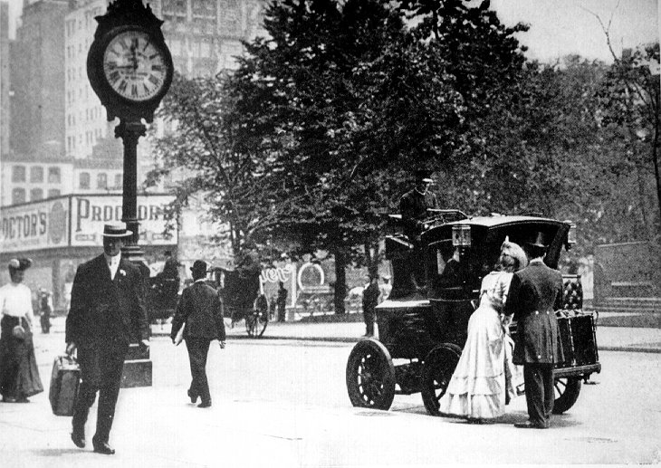 The auto-cab is the hansom's chief rival. Photo by Arthur Hewitt.The hansom cab design had worked so well for horse cabs that at least two early auto makers tried to build motor cabs around it. This one is electric.