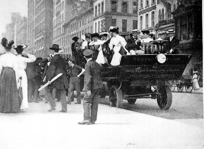 "Doing" New York. Photo by Arthur Hewitt.These tourists have climbed aboard an early motorized tour bus. The driver's seat is front and centre behind the single headlight.