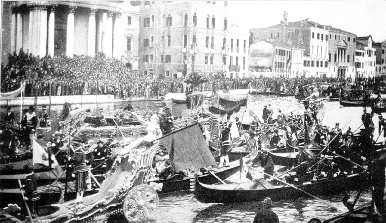 The Carnival of Venice with its fancy gondolas. Photo by Gribayedoff.Actually, the Carnival of Venice (the Venetian Mardi Gras) was suppressed by French and Austrian invaders during the Napoleonic wars and not revived until 1979. The photo was more likely taken during the annual Regatta Storica, held in September, which features a water parade of decorated gondolas and large boats.