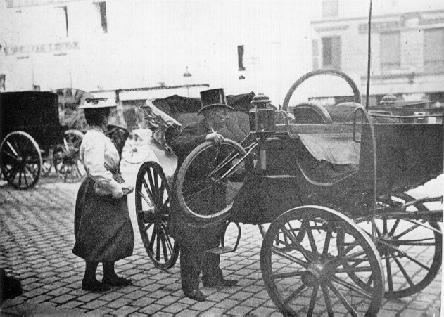 Comes in Handy when the Housewife Grows Tired of Pedaling. Photo by V. Gribayédoff.Cycling downtown and returning by cab seems to have been a common practice in Paris. A couple of contemporary postcards show cabs transporting bicycles.