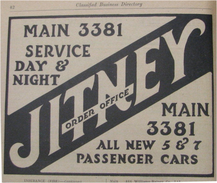 A half-page ad in the 1917 Winnipeg telephone book for the Jitney Booking Office. Taxi companies all but abandoned Henderson's Directory as an advertising medium in favour of the telephone book. In retaliation Henderson's stopped listing taxi companies in its classified directory in 1936.