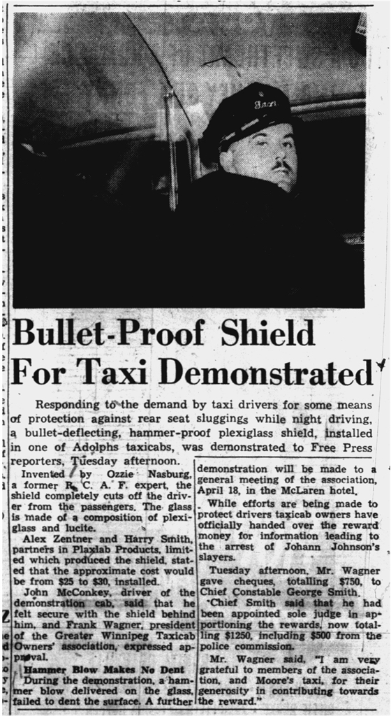 Above:April, 1946 – the O'Connor family installed a protective wire screen in their cab. Below: April, 1946 – John McConkey of Adolph's Taxi showed off a plexiglass shield installed by a local manufacturer.