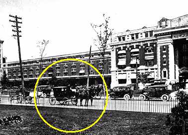 This detail from a postcard published about 1912 shows a horse cab (in yellow circle) parked on the south side of Higgins Avenue, across the street from the C.P.R. station. Behind the cab is a horse-drawn dray.