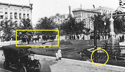 The photo (from a postcard) is dated by the year "1912" picked out in flowers around the base of a fountain (yellow circle). It shows the city hall cab stand from James Street looking toward Main.