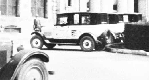 This photo shows three Black & White taxis parked outside the front entrance of the Canadian Pacific Railway Station, about 1928.