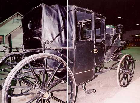 In this carriage, the forward part of the roof and the front window could be quickly removed and left in the stable on sunny days. The rear doorposts folded back with the hood. The forward doorposts went with the roof, and the posts forming the frame of the front window folded down to meet each other across the front of the passenger compartment.