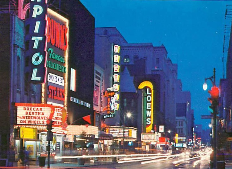 [Next column] St. Catherine Street in 1972 judging by the double bill on the Capitol Theatre marquee: Boxcar Bertha, 1972 and Werewolves on Wheels, 1971. (Source: "St. Catherine St. at Night Montréal, Canada" (detail). Photo by Marty Sheffer. Mastichrome postcard published by Benjamin-Montreal News, via Hippostcard.)