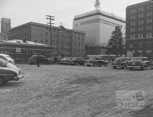 View from Place Jacques-Cartier, December 16, 1950. This is the taxi stand where Roland Faucher was parked on October 11, 1950. The low building to the left is a taxi garage. It is likely the building on which fellow drivers placed a silver plaque in his memory. (Source: Archives de la Ville de Québec, negative Q-C1-14-N003031)