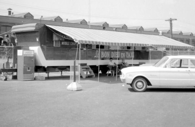 [Next column] Father Paul Aquin's mobile chapel, "Le Bon Dieu en Taxi," from which he conducted drive-in masses during the 1950s and 1960s. (Source: "La chepelle mobile 'Le bon Dieu en taxi à Montréal' (detail), via Bibliothèque et Archives nationales du Québec.)