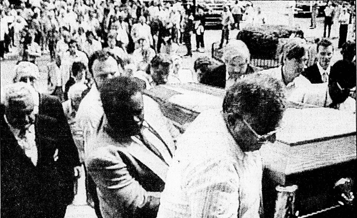 Pallbearers carry Roland Goyer's coffin into St. Vincent Ferrier church on Jarry St. East. (Source: La Presse (Montréal), August 18, 1992, p. A3. Photo by Télé-Metropole, via Bibliothèque et Archives nationales du Québec.)