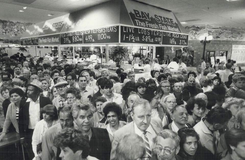 [Next column] Shoppers at the Weston Road Knob Hill Farms supermarket in 1986. This last location of the pioneering big-box grocery operation closed in 2001. (Source: "The Knob Hill Farms at Weston road and 401 in 1986. Facebook: Old Toronto Series.)