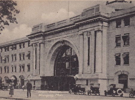 "Union Station, Winnipeg, Man." [1920s; detail of postcard]. (Source: Rob McInnes collecton WP0383, Winnipeg Public Library, Winnipeg PastForward: Winnipeg's Digital Public History)