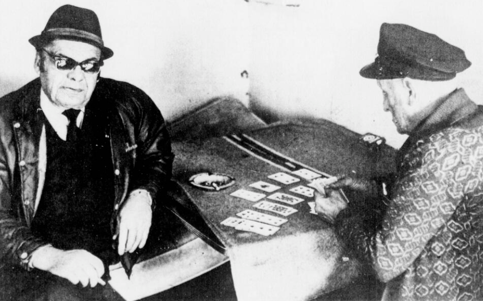 [Next column] Four months before his murder Edgar Maltais plays solitaire between trips in the "shack" on the Chibougamau taxi stand. His friend Leandre Chabot (left) spoke with the killer and saw him drive away with Mr. Maltais. (Source: Le quotidien du Saguenay-Lac-St-Jean, Friday, March 15, 1974, p. 9 via Bibliothèque et Archives nationales du Québec).